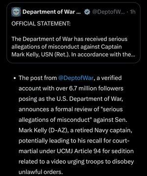 PERNYATAAN RESMI: Departemen Perang telah menerima tuduhan pelanggaran serius terhadap Kapten Mark Kelly, USN (Purn). Sesuai dengan Kode Seragam Peradilan Militer, 10 USC § 688, dan peraturan lain yang berlaku, tinjauan menyeluruh atas tuduhan ini telah dimulai untuk menentukan tindakan lebih lanjut, yang mungkin termasuk penarikan kembali ke tugas aktif untuk proses pengadilan militer atau tindakan administratif. Masalah ini akan ditangani sesuai dengan hukum militer, memastikan proses hukum dan ketidakberpihakan. Komentar resmi lebih lanjut akan dibatasi, untuk menjaga integritas persidangan. Departemen Perang mengingatkan semua individu bahwa pensiunan militer tetap tunduk pada UCMJ untuk pelanggaran yang berlaku, dan undang-undang federal seperti 18 USC § 2387 melarang tindakan yang dimaksudkan untuk mengganggu kesetiaan, moral, atau ketertiban dan disiplin angkatan bersenjata yang baik. Setiap pelanggaran akan ditangani melalui saluran hukum yang sesuai. Semua anggota militer diingatkan bahwa mereka memiliki kewajiban hukum di bawah UCMJ untuk mematuhi perintah yang sah dan bahwa perintah dianggap sah. Filosofi pribadi seorang anggota militer tidak membenarkan atau memaafkan ketidakpatuhan terhadap perintah yang sah.