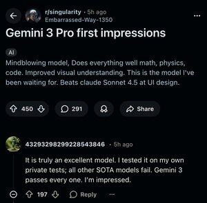 Gemini 3 Pro is de beste van Claude Sonnet 4.5 (codering, agentisch denken) en Gemini 2.5 Pro (kan eigenlijk 1m context goed aan). Het voelde alsof de modelverbeteringen lineair waren, gezien hoe de sprong van Sonnet 3.7 → 4 en GPT 4 .1 → 5 aanvoelde, maar dit is een echte sprong die een grote versieverhoging waard is. Reddit is veel beter signaal over modelprestaties dan de huidige benchmarks, en "r/singularity" is enthousiast over hoe veel beter dit is dan elk ander SOTA-model. We hebben het een tijdje getest en het is ongelooflijk om te zien hoe de hardwerkende mensen bij Google al onze feedback hebben gebruikt om het zo goed te laten werken in @cline -- vertel ons hoe je het vindt, overweeg om Claude te vervangen door Gemini als het standaardmodel!