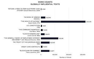 Het aantal woorden van de bitcoin white paper wordt hieronder weergegeven in relatie tot een selectie van wereldwijd invloedrijke teksten.