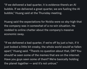 一份泄露的备忘录分享了詹森对$NVDA财报反应的看法: “历史上没有人能在几周内损失$5000亿。你必须非常有价值才能在几周内损失$5000亿。”