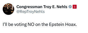 新聞:特洛伊·內赫爾斯(Troy Nehls)幾天前表示,他對於釋放“愛潑斯坦騙局”持堅決的“否定”態度,這是民主黨設計的,旨在“讓我們分心,無法專注於特朗普總統及其政府的勝利”,告訴我他將投票支持釋放。 這意味著很可能會達成一致。